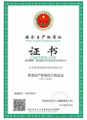 江蘇省誠(chéng)信教學(xué)設(shè)備有限公司成立于2003年,是一家專注教學(xué)設(shè)備研究開(kāi)發(fā)、生產(chǎn)制造、銷售服務(wù)為一體的綜合性教育、服務(wù)型企業(yè),是江蘇省教育設(shè)備行業(yè)協(xié)會(huì)會(huì)員單位、中國(guó)教育裝備行業(yè)協(xié)會(huì)會(huì)員單位,公司先后通過(guò)ISO9001國(guó)際質(zhì)量管理體系認(rèn)證、IS14001國(guó)際環(huán)境管理體系認(rèn)證、OHSAS18001職業(yè)健康安全管理體系認(rèn)證。數(shù)十年的激勵(lì)前行鑄就企業(yè)優(yōu)質(zhì)的產(chǎn)品品質(zhì)和服務(wù)質(zhì)量。